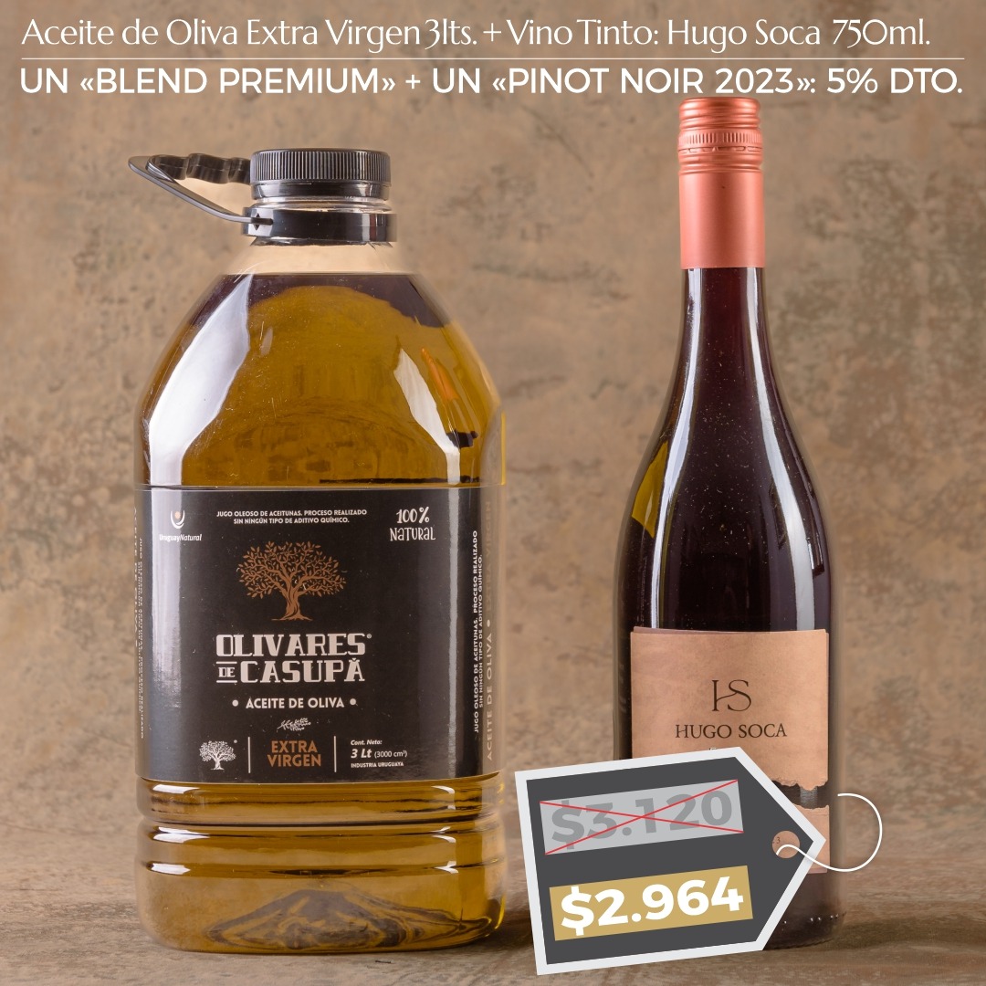 ¡PROMOCIÓN! Un «BP» 3lts. + Un «PINOT NOIR 2023» Hugo Soca. 750ml. Dto. 5%.
